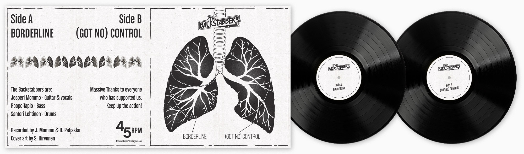 The Backstabbers 7" kansitaide sekä kansien ja labeleiden taitto